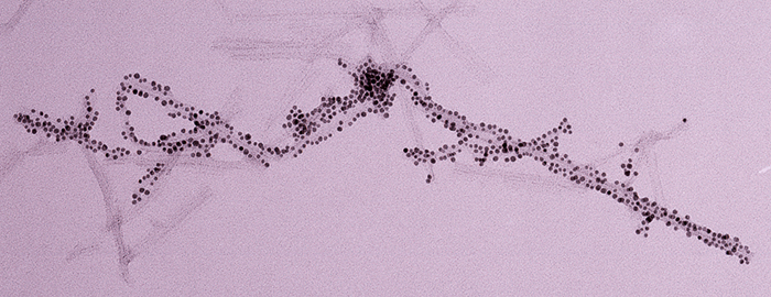 In the picture above, this was an attempt to make a single wire (a nanowire) out of a filament of protein, for just such a nano-circuit board. Of course, these filaments are no good for conducting electricity on their own; they are only the scaffold onto which we plaster a metal, such as gold, which does conduct electricity. So, firstly we’ve got to change the properties of the individual proteins that make up the amyloid filaments, so that gold now likes to bind to them; then we can add gold in the form of gold nanoparticles. In the picture above you can see the gold nanoparticles as small spheres, only 5 nanometres wide, each consisting of a cluster of around 100 gold atoms. We buy the gold in a solution, and as the nanoparticles are so small, they just float around, never settling, and appear red coloured to the eye.