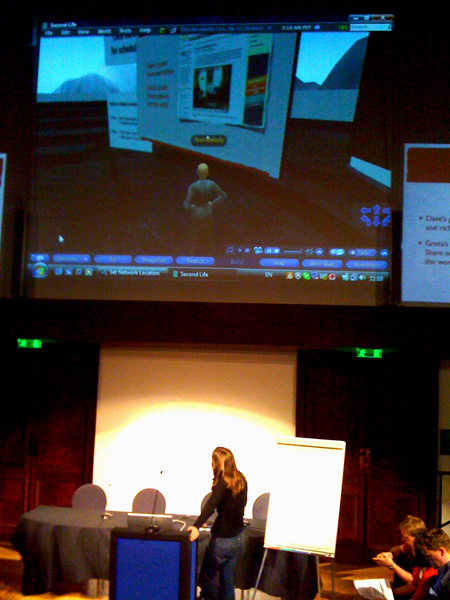 Second life feedThe screen was then set for the remainder of the conference by entering Second Life, the virtual world developed by Linden Lab, where delegates unable to get to London had to this point been watching proceedings at the RI via video feed. The next session covered blogging for impact, discussing whether blogging can actually help our careers rather than hinder them. It was a novel experience to have David Munger present his powerpoint slides from within Second Life, viewed on our big screen, with the other Second Life delegates sitting, or moving around, in their own theatre.